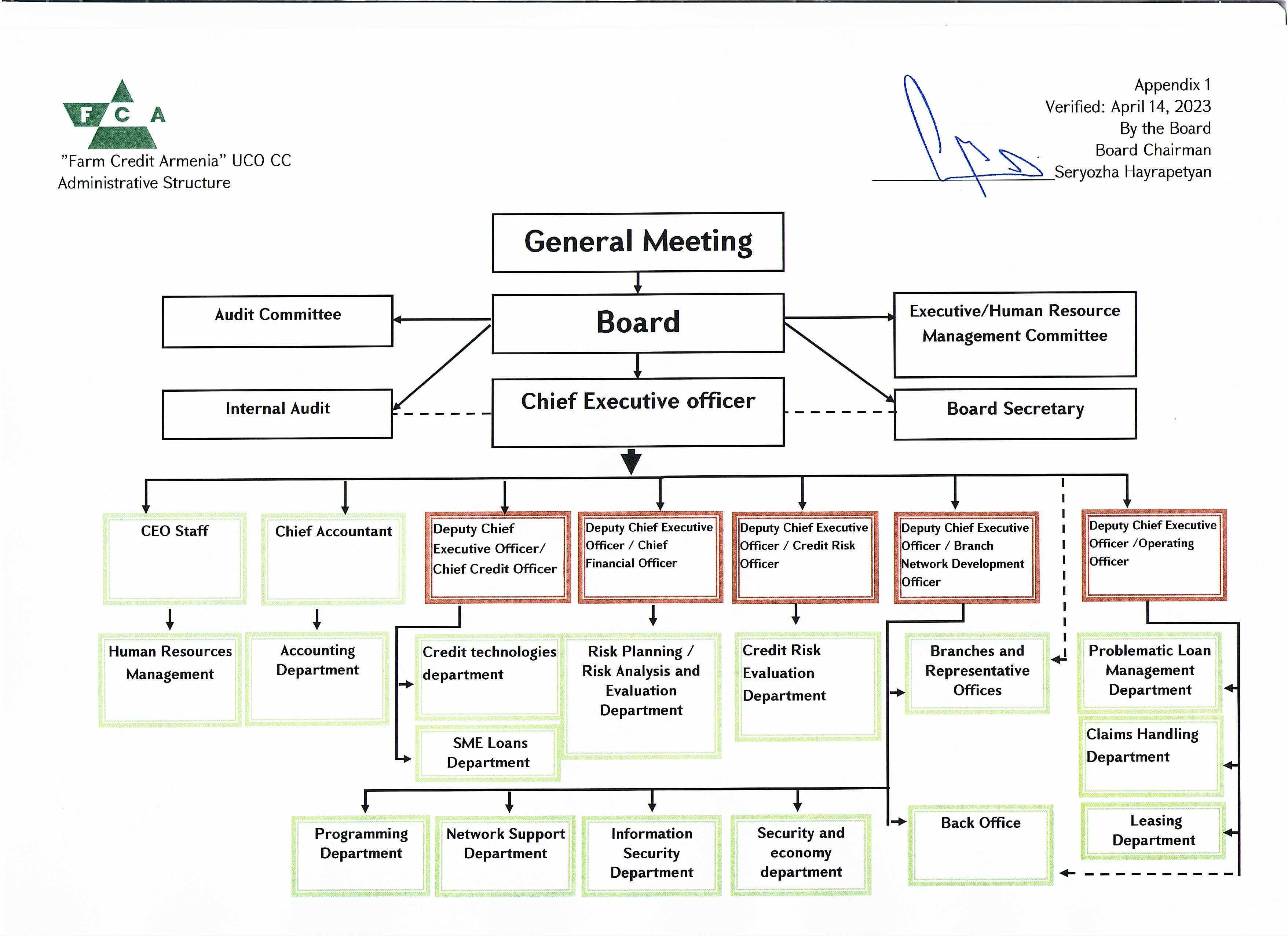 The administrative structure and its development is extremely important to Farm Credit Armenia. The organizational structure is under continuous development which leads to the effectiveness of the organization.